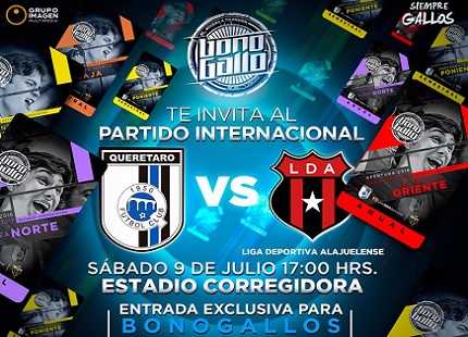 Partido muy interesante tendremos este sábado 9 de julio continuando con los últimos partidos de preparación de los equipos mexicanos, este día será la Presentación Oficial del Querétaro que querrá demostrarle a su afición que tiene un equipo competitivo y que es capaz de pelear por algo importante en el próximo Torneo Apertura 2016 que esta a punto de iniciar, como rival tendrá a uno de los más grandes de Costa Rica, el Alajuelense, que quiere demostrar el buen fútbol que tienen e irán con la intención de apagar la fiesta en el Estadio La Corregidora en el que únicamente podrán ingresar personas que cuenten con el BonoGallo, no abra venta de boletos al público.