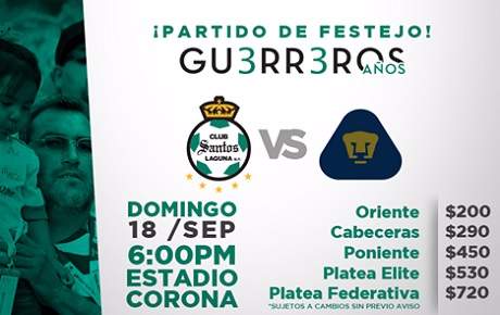 El partido Santos vs Pumas estará arrancando a las 18:00 horas, 6:00 pm del centro de la República Mexicana (4:00 pm PT y 7:00 pm ET en los Estados Unidos), cuando Oscar Macías Romo haga sonar su ocarina en el Estadio Corona ubicado en el TSM de la ciudad de Torreón, Coahuila este domingo 18 de septiembre.