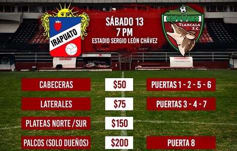 El juego entre Irapuato vs Tlaxcala se estará disputando en punto de las 19:00, 7:00 pm, hora local de Guanajuato y hora del centro de México; en los Estados Unidos el partido comenzará a las 5:00 pm hora del Pacífico y a las 8:00 pm hora del Este.