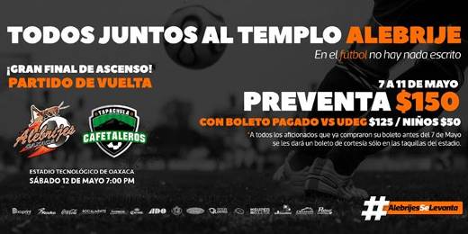 Partido que parece de trámite nos espera este sábado 12 de mayo cuando se dispute la vuelta de la Final por el Ascenso MX 2018, aunque sin Ascenso, donde los Alebrijes buscarán la máxima remontada en la historia de una final de ascenso, algo que parece imposible ante unos Cafetaleros que llegan muy motivados y en un gran momento, listos para levantar el título en su visita al Estadio Tecnológico de Oaxaca.