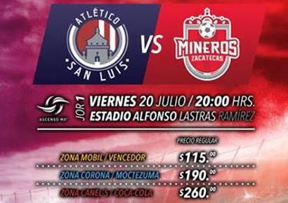 Gran partido nos espera este viernes 20 de julio arrancando la actividad del Ascenso MX Apertura 2018 con dos equipos llamados a ser protagonistas y con derecho a ascender, ya que el Atlético San Luis buscará iniciar la temporada con las tres unidades estando en casa, pero se medirán a los Mineros de Zacatecas que buscarán sumar en su visita a la cancha del Estadio Alfonso Lastras.