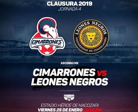 Gran partido nos espera este viernes 25 de enero cerrando la actividad del día en la jornada 4 del Ascenso MX Clausura 2019, donde los Cimarrones buscarán aprovechar su condición de local para sumar una nueva victoria que les permita consolidarse entre los líderes, pero tendrán que recibir a unos Leones Negros que llegan motivados listos para salir con puntos de su visita al Estadio Jalisco.