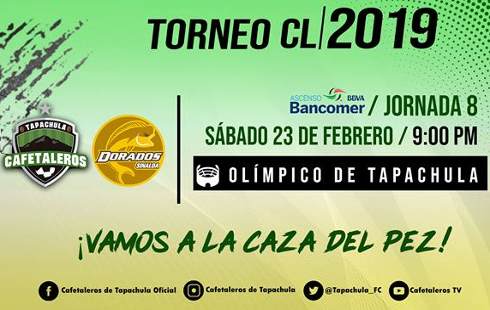 Cerramos las emociones de este sábado 23 de febrero en la jornada 8 del Ascenso MX Clausura 2019, cuando los Cafetaleros busquen aprovechar su condición de local para sumar una victoria que les permita dar un paso en la pelea por la liguilla, pero recibirá a unos Dorados que llegan desesperados por ganar en su visita al Estadio Olímpico de Tapachula.
