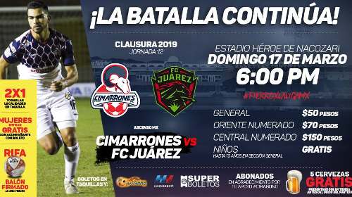 Se cierran las emociones de la jornada 12 del Ascenso MX Clausura 2019 este domingo 17 de marzo, cuando los Cimarrones busquen aprovechar su condición de local para sumar una victoria que les permita dar un gran paso en la pelea por la clasificación, saben que en casa no deben fallar cuando reciban a los Bravos de Juárez que llegan urgidos de sumar en su visita al Estadio Héroe de Nacozari.